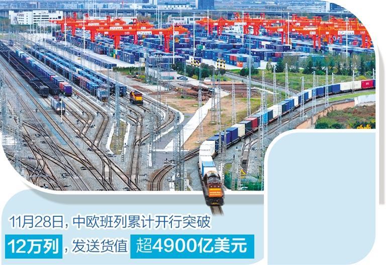 11月28日,随着开往波兰马拉舍维奇的中欧班列缓缓从中国成都出发,中欧班列总数突破12万列,货运价值突破4900亿美元。作为共建“一带一路”务实合作的承载者,中欧班列以其强大的生命力和韧性发展,搭建了沿线经贸合作新平台,有力保障了国际产业链供应链稳定,为世界经济发展注入新动能。